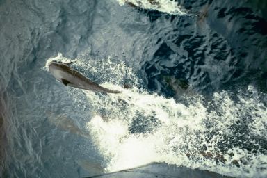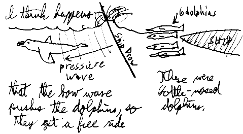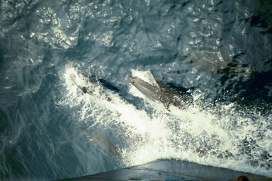 Six, and sometimes as many as ten, dolphins were just riding the bow wave in front of the ship. Occasionally one of them would spurt ahead and jump out of the water to then resume his or her place. Once a pair of them spurted ahead and executed simultaneous leaps fifteen feet in the air!